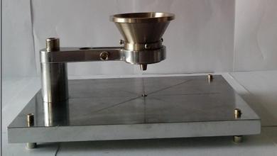 安息角测定仪用于测定自然流动状态下粉体的安息角。 安息角测定仪主要技术资料: 1、不锈钢漏斗:内经74mm,下料口内经6mm,两档板间装有孔径为1mm的筛网。此漏斗被紧固在支架上。 2、电镀钢底板:底板由钢制成或大理石、不锈钢等耐腐蚀的材料制成,尺寸为:宽200mm、长270mm、厚18mm。在抛光电镀的底板上表面上刻有四条互成45。角的直线。正好在漏斗处的中心部分有1个固定高度量规的定位销,底板下面有3个可调水平的支脚。 3、漏斗固定器:由不锈钢组成,其结构应紧固。漏斗中心线垂直于中心定位销。 4、高度量规(决定高度的金属圆柱体):它是表面抛光的由不锈钢制成的圆柱体, 高40mm,底部有一凹槽,以便完整同底板的定位销中心相衔接。